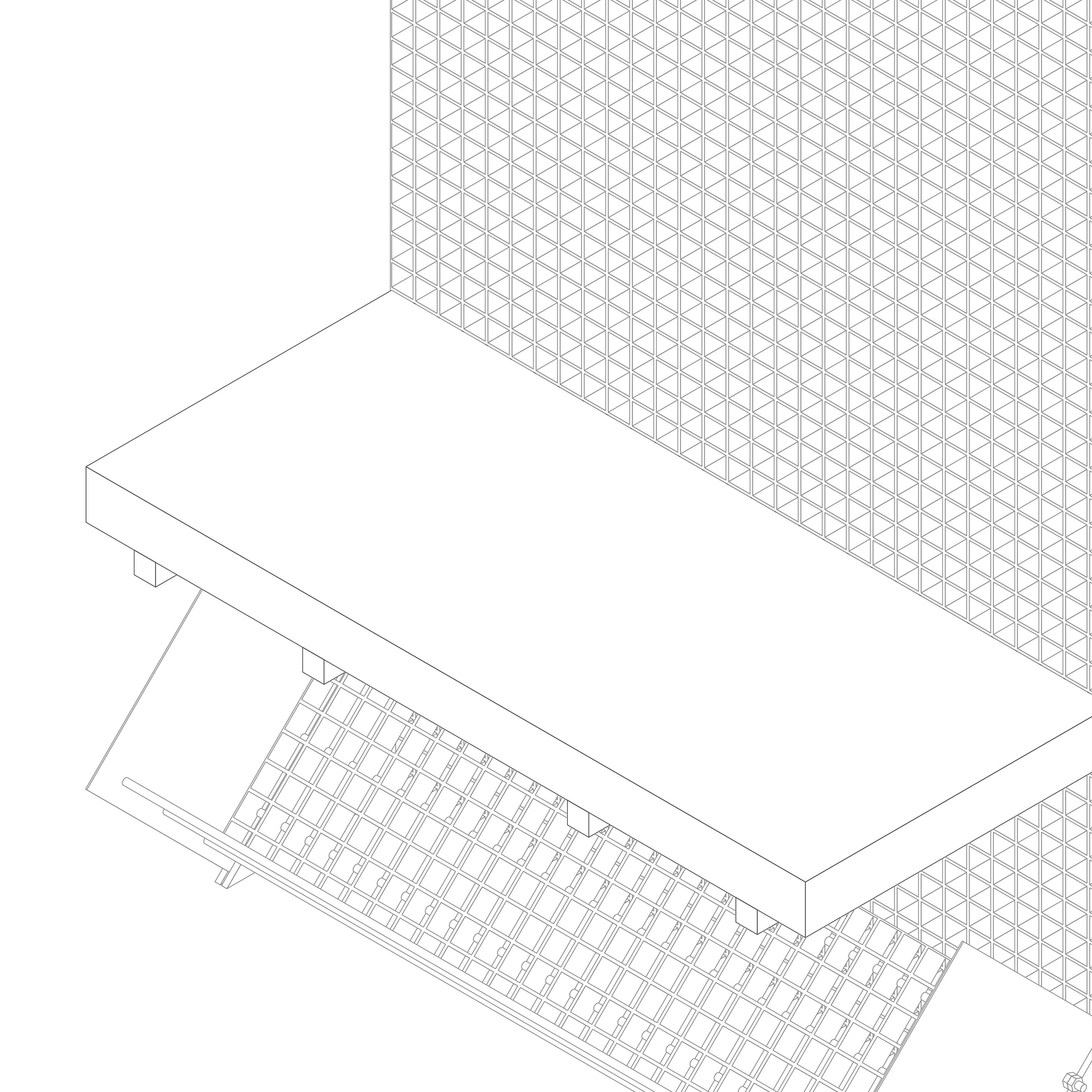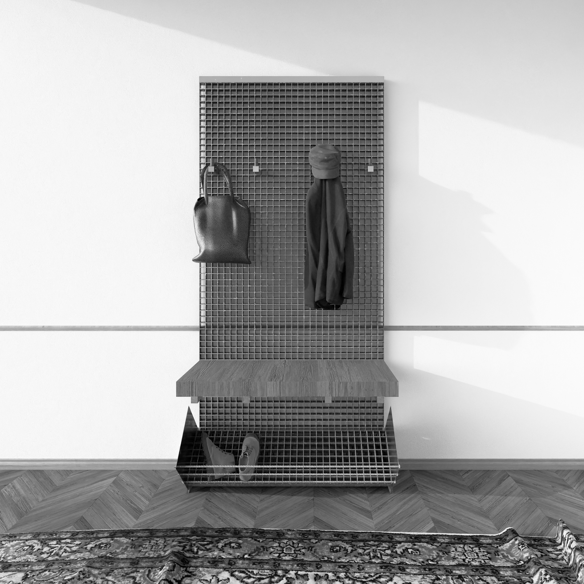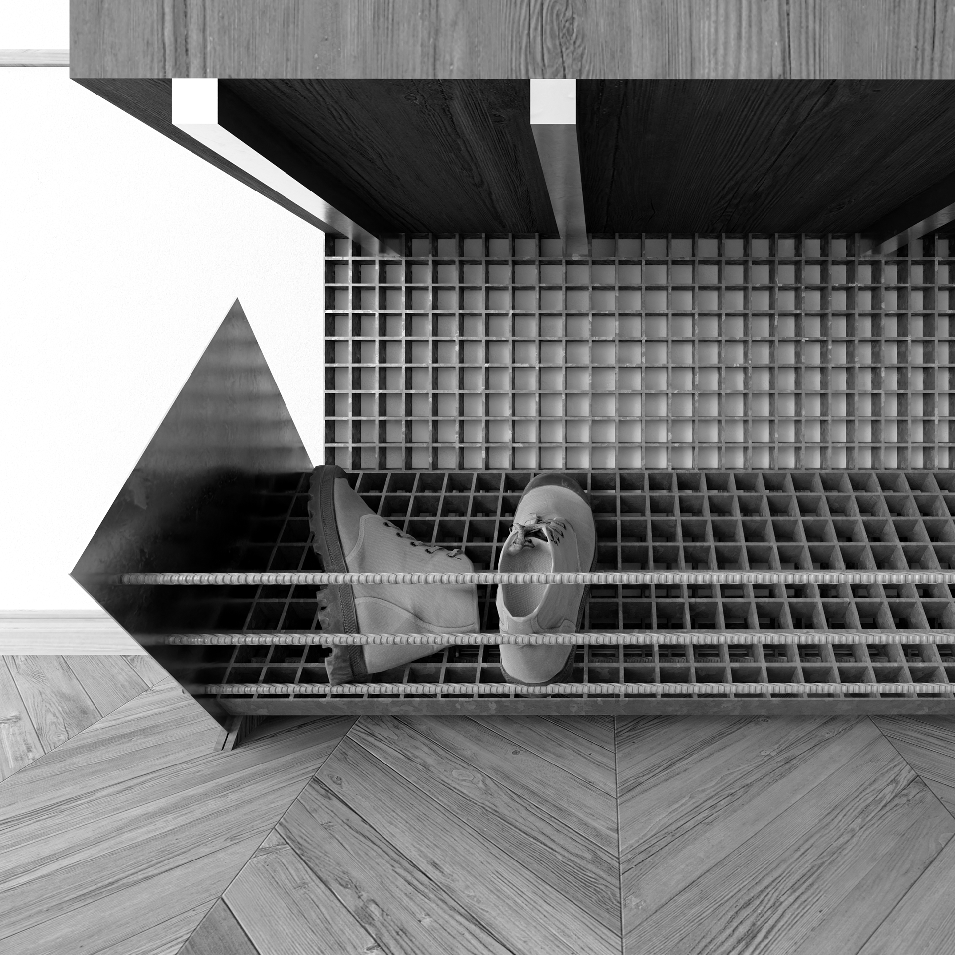 Steel grating defines storage and void,
